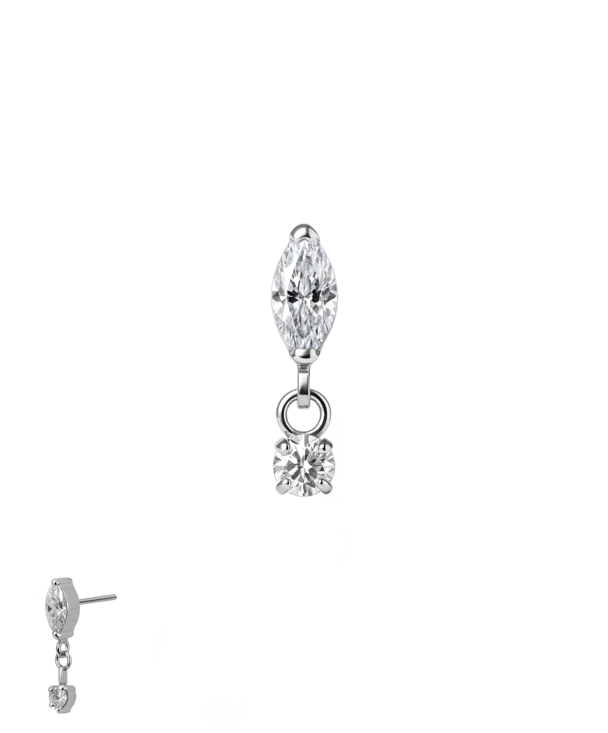 Frost Drop kombiniert zeitlose Formen mit moderner Leichtigkeit. Der Marquise-Schliff sorgt für elegante Linienführung, während der bewegliche runde Stein bei jeder Bewegung ein sanftes Glitzern entfaltet.