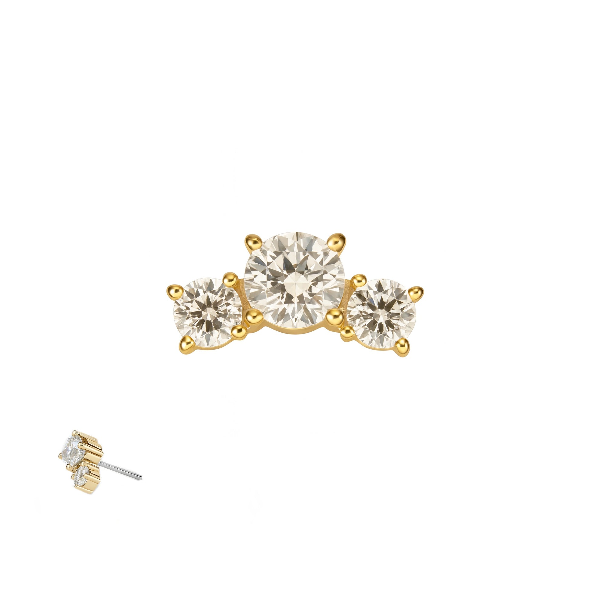 Tri Prima kombiniert klassische Eleganz mit moderner Ausstrahlung. Drei brillant geschliffene Steine in harmonischer Anordnung, gefasst in hochwertigem 14 Karat Gold, sorgen für ein zeitloses Funkeln mit Stil.