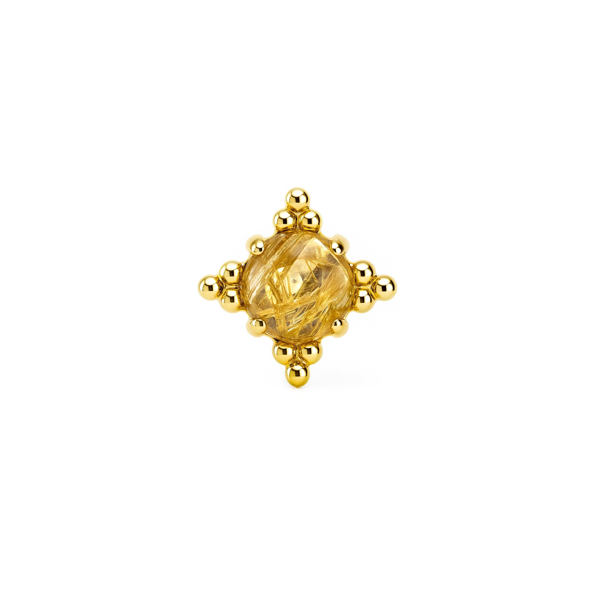 Zia vereint präzise Goldschmiedekunst mit der natürlichen Magie des Rutilquarzes. Die goldenen Einschlüsse im Inneren des Steins wirken wie eingefangene Lichtstrahlen, während die symmetrisch angeordneten Kugeln an eine antike Sonne oder ein leuchtendes Himmelszeichen erinnern.